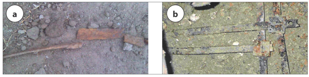 a) po 6 latach eksploatacji w charakterze uziomu dodatkowego stopy fundamentowej słupa wysokiego napięcia 220 V w Sudanie (jednym z czynników szybkiej korozji było połączenie bednarki ze zbrojeniem fundamentu słupa);