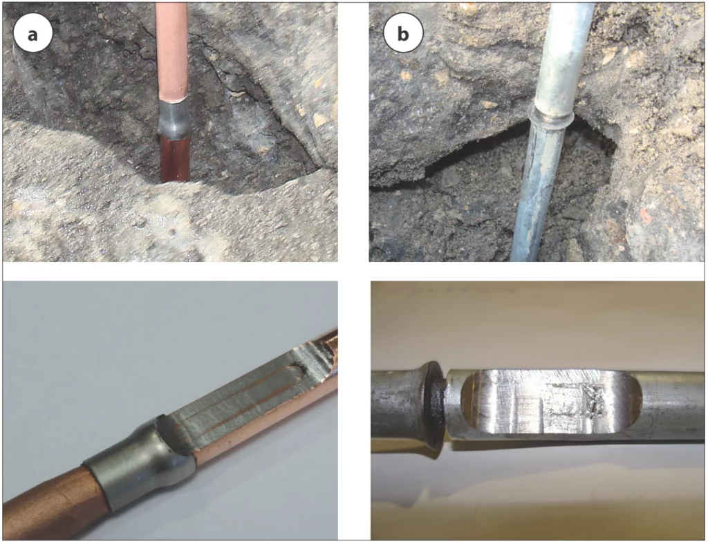 Korozja uziomu prowadzi do wzrostu rezystancji uziemienia, a w skrajnych przypadkach nawet do jego całkowitego zniszczenia. Na fot. 5b przedstawiono przykład stalowej bednarki ocynkowanej umieszczonej w gruncie, która połączona z uziomami fundamentowymi konstrukcji masztu antenowego uległa bardzo silnej korozji po 12 latach eksploatacji. Podobnie jak w przypadku łączenia różnych materiałów w instalacji elektrycznej, gdzie przykładowo nie jest dopuszczalne bezpośrednie łączenie elementów aluminiowych z miedzianymi, należy zwracać uwagę na dobór właściwych materiałów w systemach uziemiających.