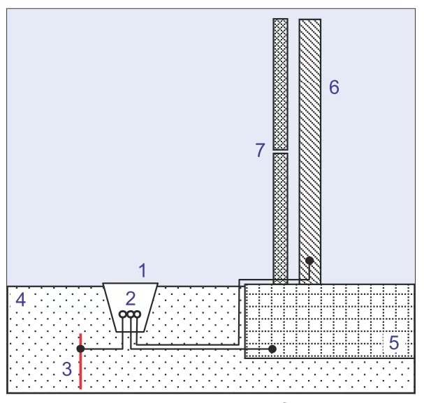 2 – złącze kontrolne, 3 – uziom sztuczny (dodatkowy), 4. – rodzimy grunt,